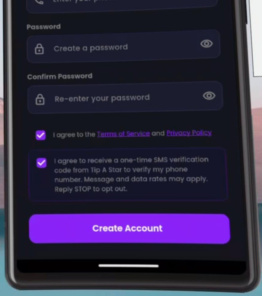 "I agree to receive a one-time SMS verification code from Tip A Star to verify my phone number. Message and data rates may apply. Reply STOP to opt out."